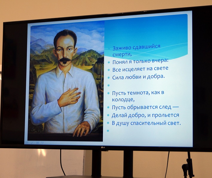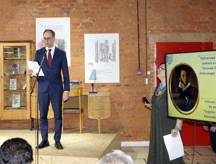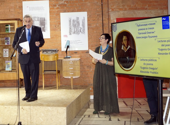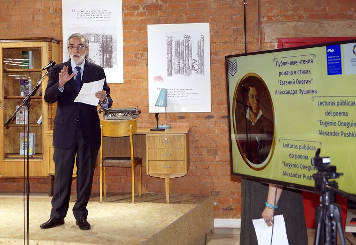 Отрывок «Мой дядя самых честных правил…» исполнил Михаил Шепель, генеральный директор БИЛ, на русском языке и Энрике Хуан Дельгадо Хента, Посол Восточной Республики Уругвай, на испанском. Другой отрывок романа «Евгений Онегин» прозвучал в исполнении Родриго Хосе Ньето Матурана, Посла Республики Чили. Продолжил читать строки Пушкина «Блажен, кто смолоду был молод...» на испанском Густаво Пиегас, атташе по культуре Посольства Восточной Республики Уругвай. Знакомое со школы «Письмо Татьяны к Онегину»: «Я к вам пишу, чего же боле...» прочитала на русском Светлана Горохова, директор по международной деятельности БИЛ, а Десислава Парушева, советник Посольства Республики Болгария, на испанском и Татьяна Евграфова, руководитель Ибероамериканского культурного центра – на португальском языке.