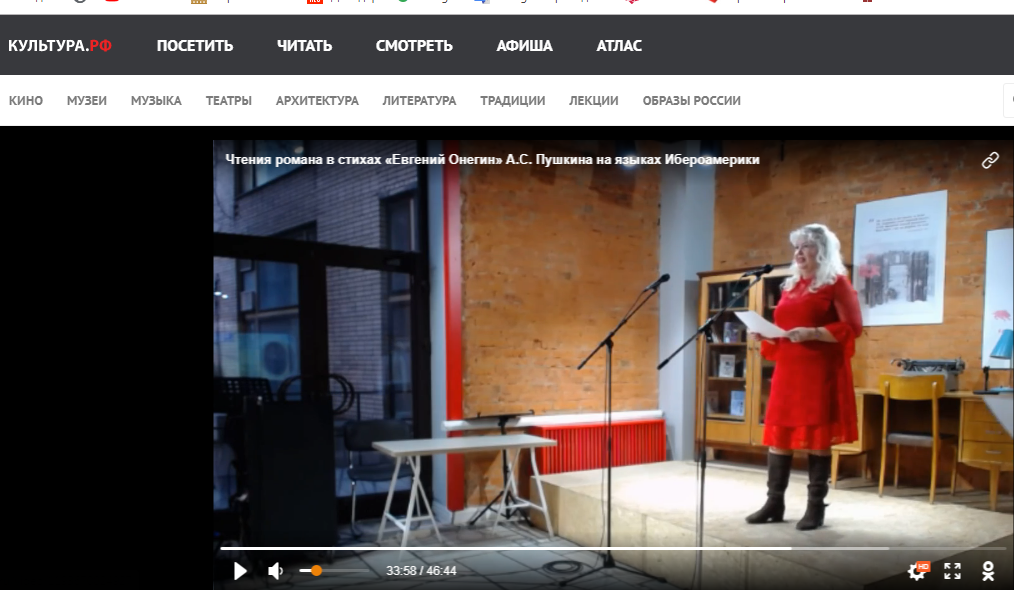 Публичные чтения романа в стихах «Евгений Онегин» А.С. Пушкина на испанском, португальском и русском языках прошли 30 ноября в Библиотеке иностранной литературы им. М.И. Рудомино (БИЛ) в рамках празднования Ибероамериканского Фестиваля. Чтения транслировались в прямом эфире на канале «Культура РФ».