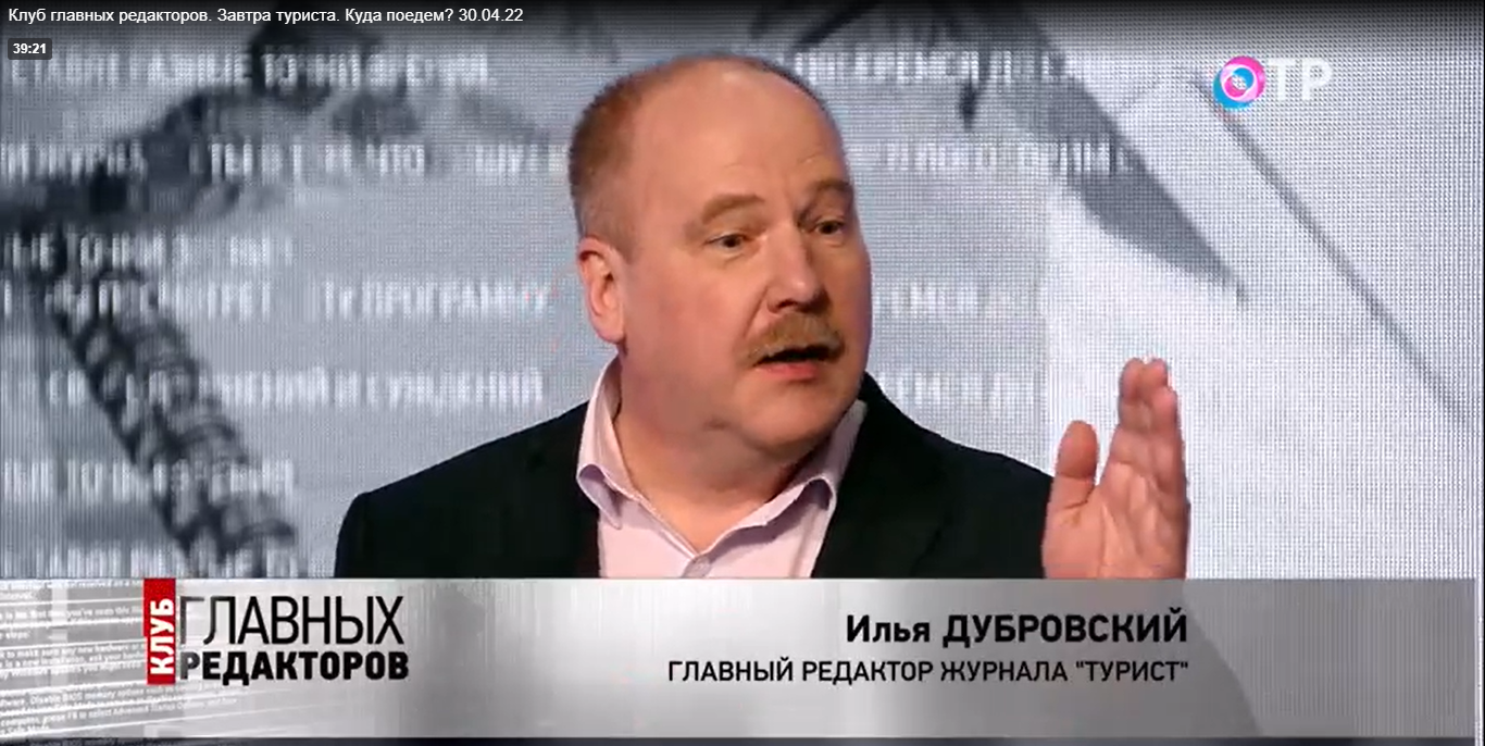 В апреле вышла программа "Клуб главных редакторов" Павла Гусева на канале ОТР. В передаче принял участие главный редактор журнала ТУРИСТ Илья Дубровский.Речь шла о проблемах туризма сегодняшнего дня, об ограничениях въездного и внешнего выездного туризма и о том, как будет развиваться туриндустрия в ближайшем будущем у нас в стране. Гости и ведущий, как и те, у кого брали интервью на улицах города, были едины во мнении, что несмотря на отдельные проблемы и сложности, люди будут путешествовать, а туризм будет развиваться.